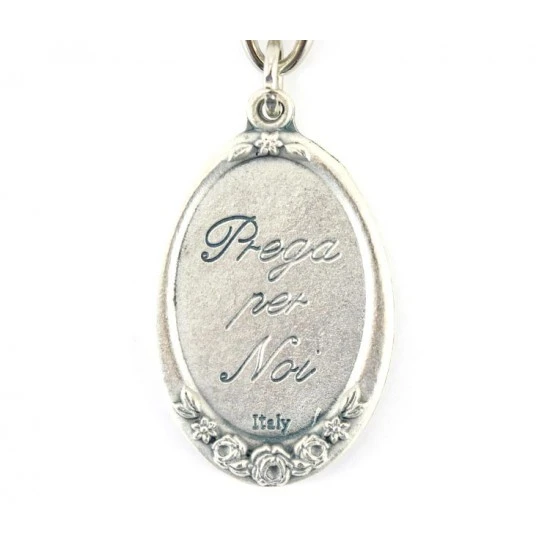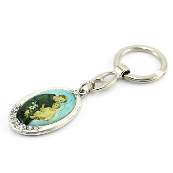 Portachiavi Sant’Antonio realizzato in metallo ovale argentato antichizzato con resinato colorato, munito di gancio ad anello. Made in Italy