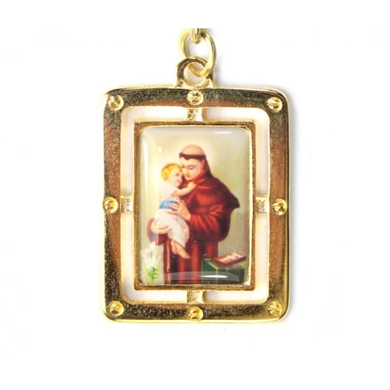 Portachiavi Sant’Antonio rettangolare realizzato in metallo dorato e resinato colorato, munito di gancio ad anello. Made in Italy