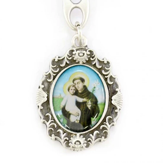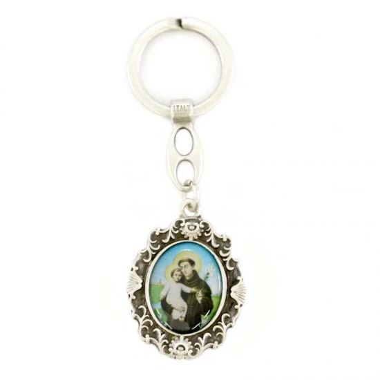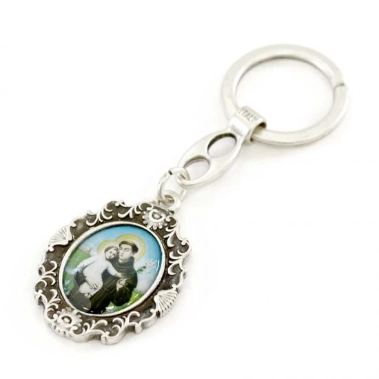 Portachiavi Sant’Antonio realizzato in metallo argentato nikel e resinato colorato, munito di gancio ad anello. Made in Italy