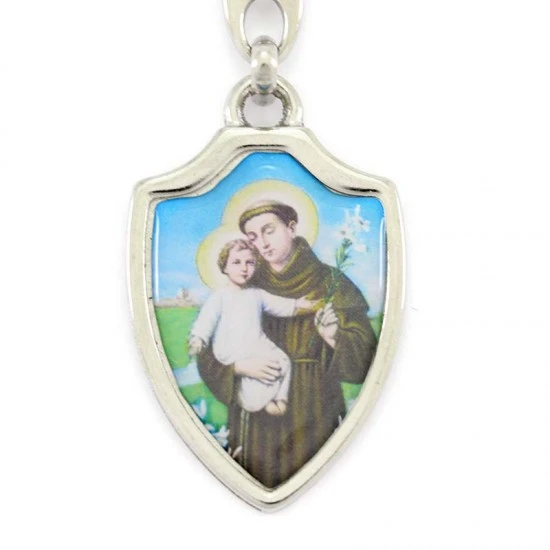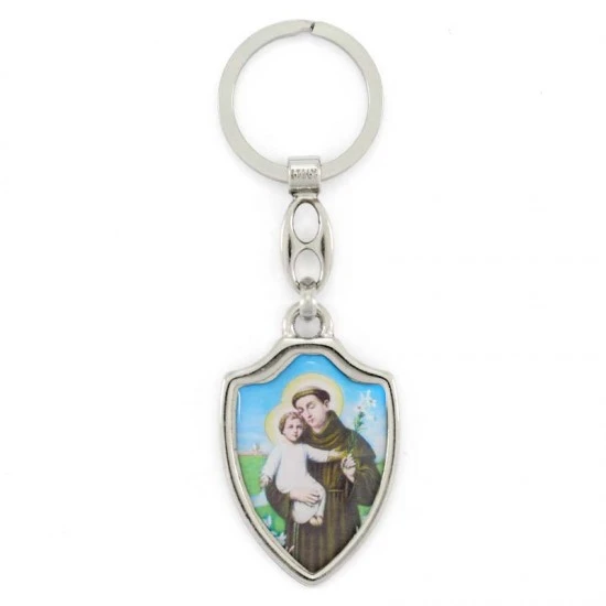 Portachiavi Sant’Antonio scudo realizzato in metallo argentato nikel e resinato colorato, munito di gancio ad anello. Made in Italy