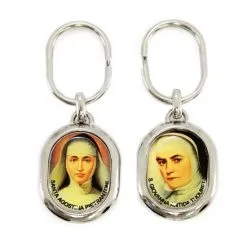 Portachiavi ovale in metallo nichelato con raffigurazione di Santa Giovanna Antida Thouret e Santa Agostina Pietrantoni realizzate in resina colorata. Il portachiavi è munito di gancio ad anello molto resistente ed è fornito in bustina di plastica trasparente. Made in Italy