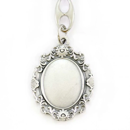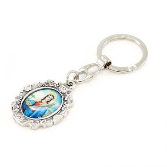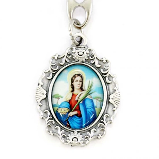 Portachiavi Santa Lucia realizzato in metallo argentato nikel e resinato colorato, munito di gancio ad anello. Made in Italy
