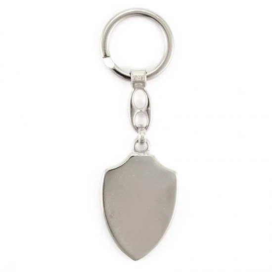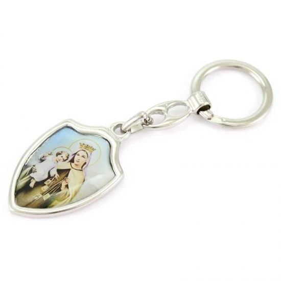 Portachiavi scudo Madonna del Carmine realizzato in metallo nichelato argentato con resinato colorato, munito di gancio ad anello solido e sicuro. Made in Italy