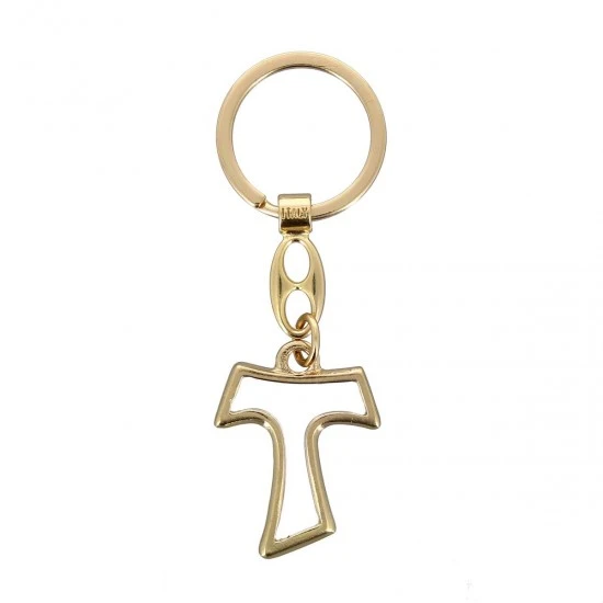 Portachiavi Tau realizzato interamente in metallo dorato, munito di gancio ad anello molto resistente. Simpatico prodotto adatto come bomboniera o ricordino in occasione della Prima Comunione. Fornito confezionato in bustina di plastica trasparente. Made in Italy