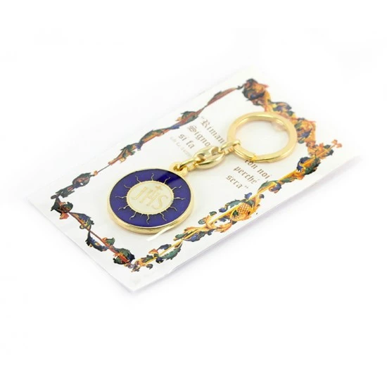 Portachiavi dorato IHS realizzato in metallo dorato con smalto blu, munito di gancio ad anello e confezionato in bustina trasparente. Made in Italy