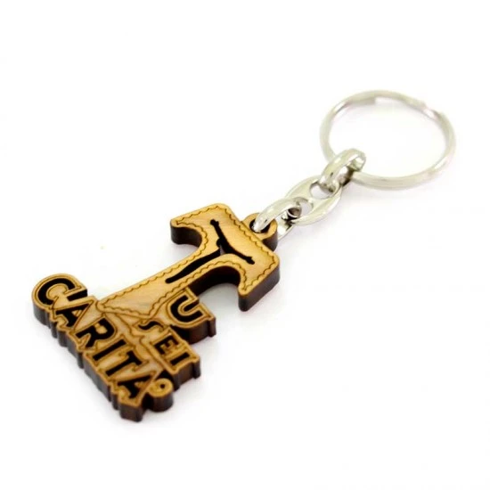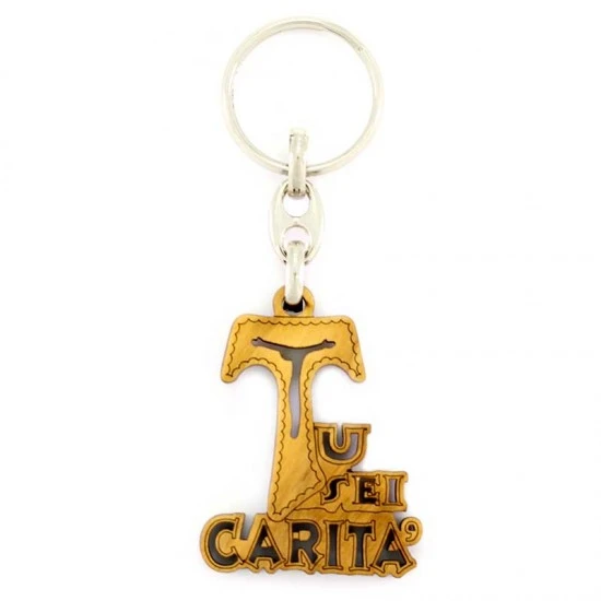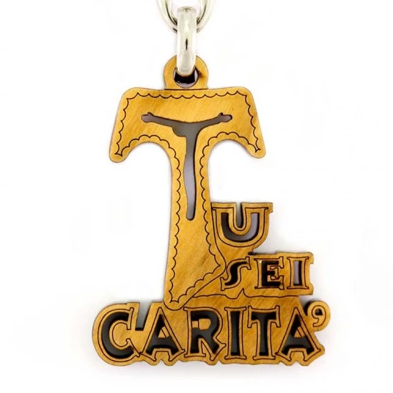 Portachiavi Tu sei Carità realizzato in legno di ulivo con lavorazione a laser , munito di gancio ad anello. Confezionato in bustina di plastica trasparente. Made in Italy