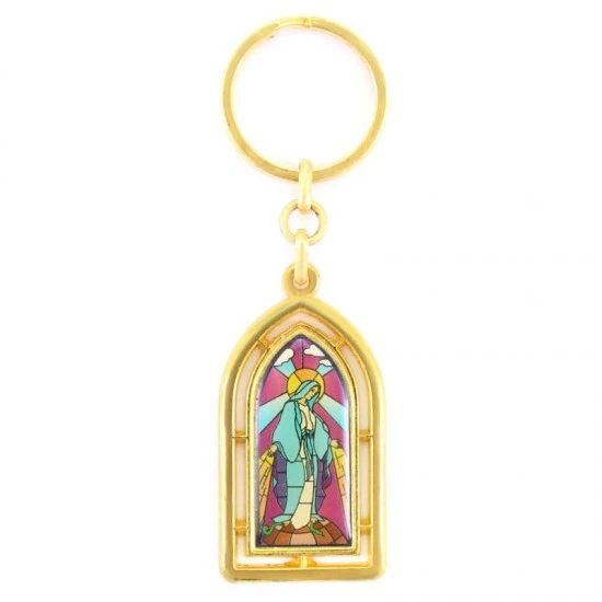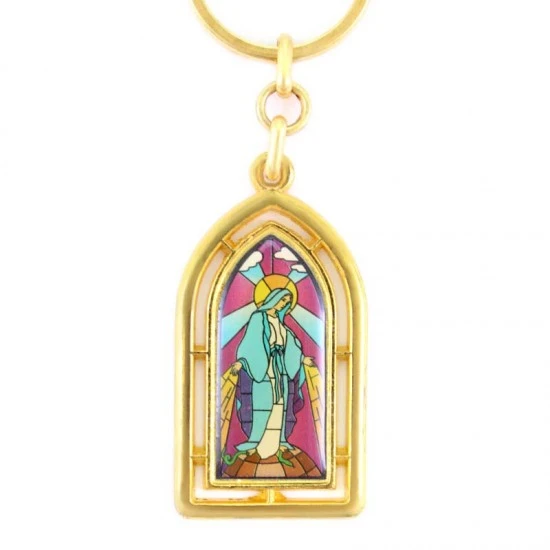 Portachiavi vetrata raffigurante La Madonna Miracolosa realizzato in metallo dorato e munito di gancio ad anello molto resistente. Made in Italy