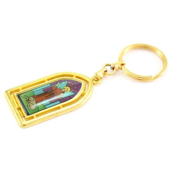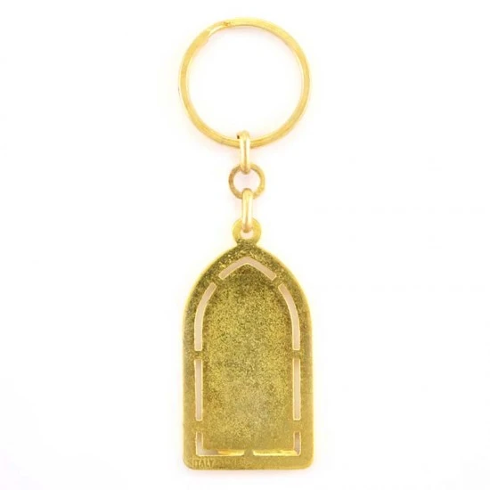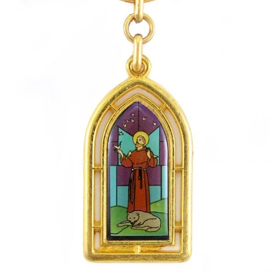 Portachiavi vetrata raffigurante San Francesco realizzato in metallo dorato e munito di gancio ad anello molto resistente. Made in Italy