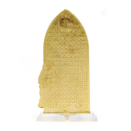 Quadretto Madonna di Lourdes realizzato in metallo dorato con raffigurazione della Basilica in resina colorata, fornito in bustina scatola di plastica trasparente. Made in Italy