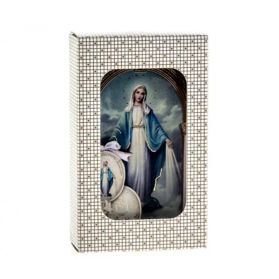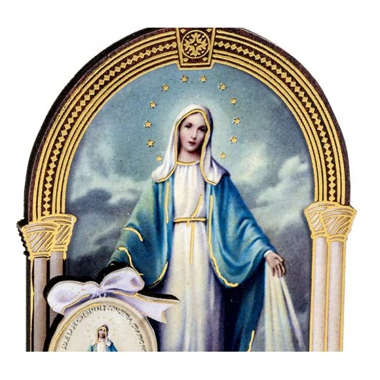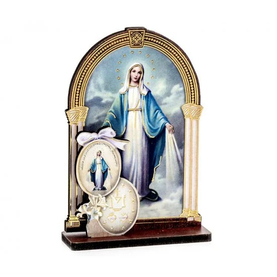 Quadretto bidimensionale da poggiare tipo legno a forma di tempio con immagine della Madonna Miracolosa lavorata a caldo foglia oro con medaglie. Confezionato in scatola di cartone con finestra plastica trasparente. Made in Italy