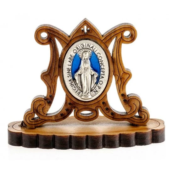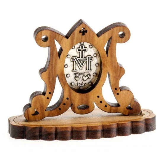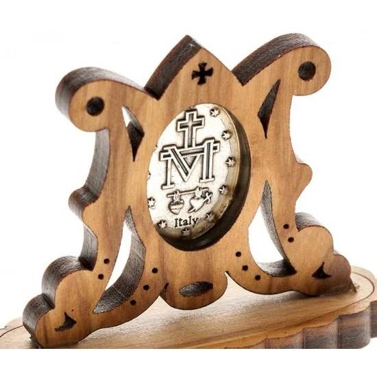Quadretto da poggiare in legno di ulivo a forma di M mariana lavorato ed inciso a laser con medaglia della Madonna Miracolosa in metallo argentato e smalto blu. Visibile sia sul fronte che sul retro. Made in Italy.