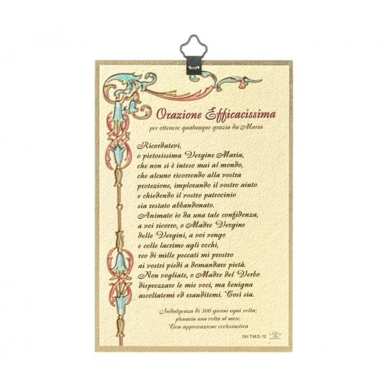 Quadretto tipo legno con immagine della Madonna Miracolosa con medaglie stampa oro a caldo sfondo mosaico e retro con preghiera Orazione efficacissima. Made in Italy