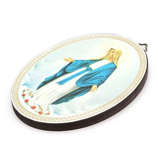 Quadretto Madonna Miracolosa realizzato di forma ovale interamente in legno con immagine stampata. Prodotto eseguito con lavorazione artigianale di ottima fattura e ben rifinito nei particolari, fornito in scatola di cellophan trasparente. Made in Italy