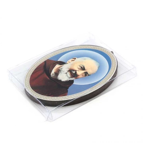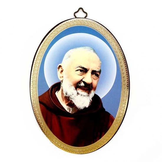 Quadretto San Pio da Pietrelcina realizzato di forma ovale interamente in legno con immagine stampata. Prodotto eseguito con lavorazione artigianale di ottima fattura e ben rifinito nei particolari, fornito in scatola di cellophan trasparente. Made in Italy