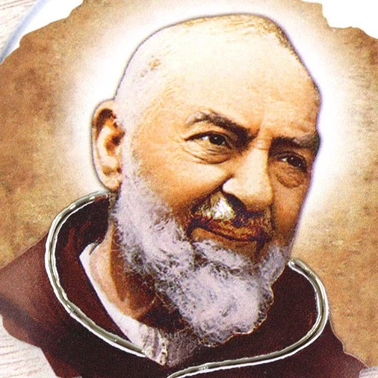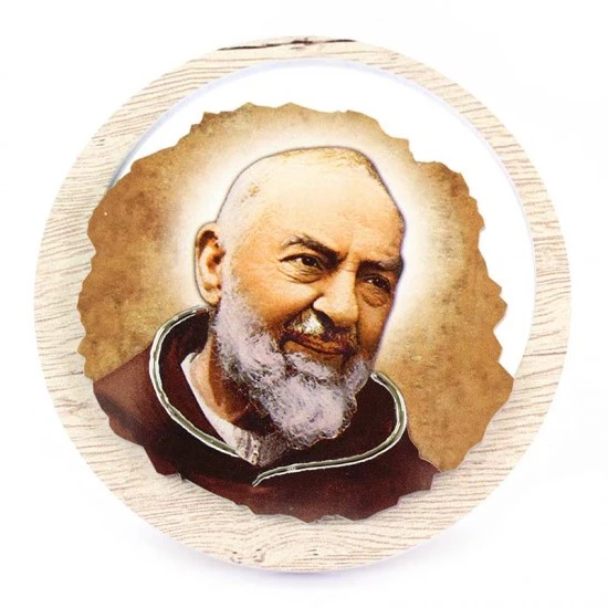 Quadretto San Pio da Pietrelcina realizzato di forma circolare in legno colorato con colori pastello ed eleganti inserti argentati. Prodotto eseguito con lavorazione artigianale di ottima fattura e ben rifinito nei particolari, corredato di piedino in metallo per essere appoggiato e confezionato in elegante scatola di cartone colore bianco. Made in Italy