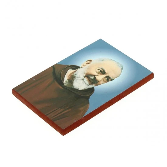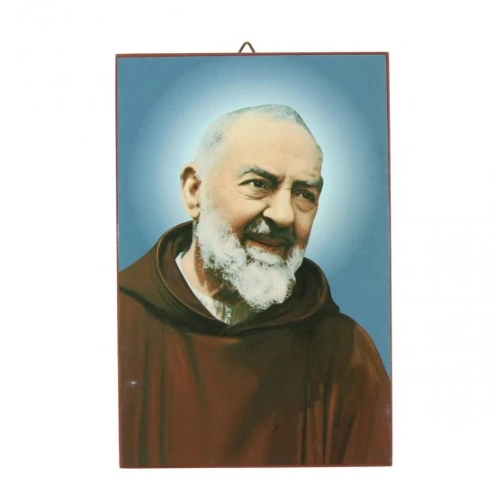 Quadretto San Pio realizzato con immagine stampata su tavoletta in legno. Prodotto eseguito con lavorazione artigianale di ottima fattura e ben rifinito confezionato in bustina di plastica trasparente. Made in Italy