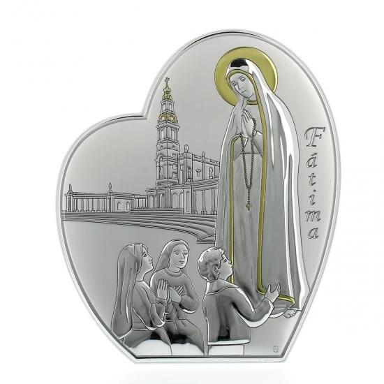 Quadro sagomato raffigurante la Madonna di Fatima realizzato in alluminio argentato impreziosito da decorazioni dorate e retro in legno bianco. Fornito munito di piedino in legno per sostenerlo e foro sul retro per appenderlo. Prodotto di ottima fattura e ben rifinito nei particolari confezionato in elegante scatola di cartone. Made in Italy