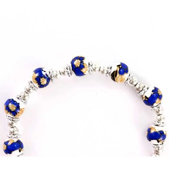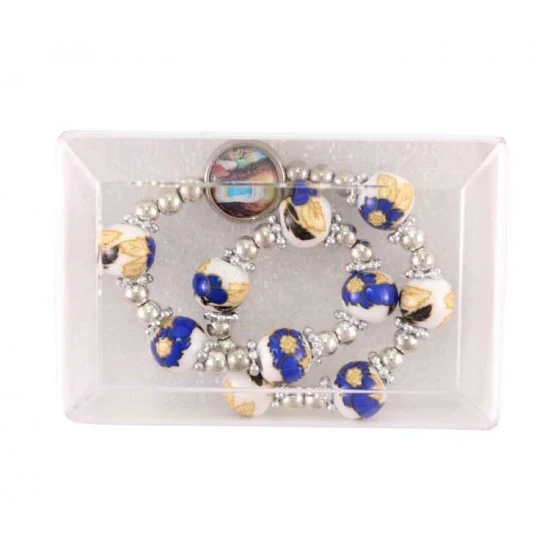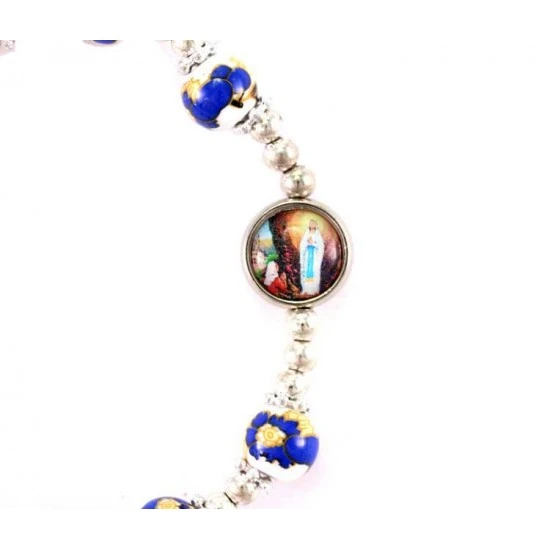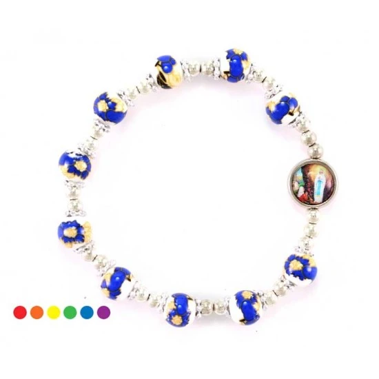 Rosario a bracciale elastico realizzato con grani in ceramica dipinta, arricchito da resinato circolare colorato con raffigurazione della Madonna di Lourdes.