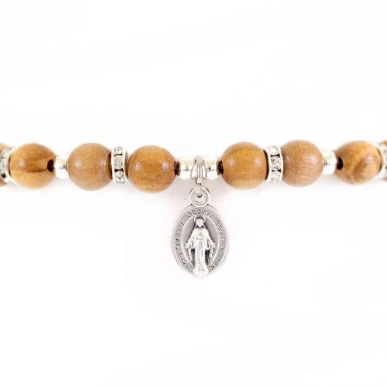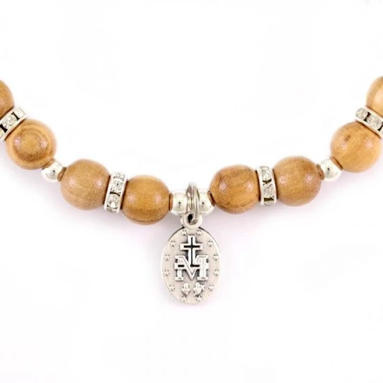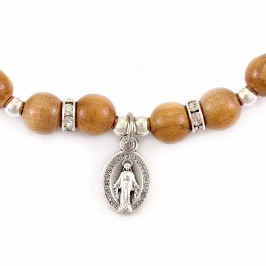 Rosario a bracciale elastico realizzato con grani tondi in legno di ulivo intervallati da piccoli grani in metallo argentato. Il bracciale è fornito completo di medaglina pendente Madonna Miracolosa in metallo argentato.