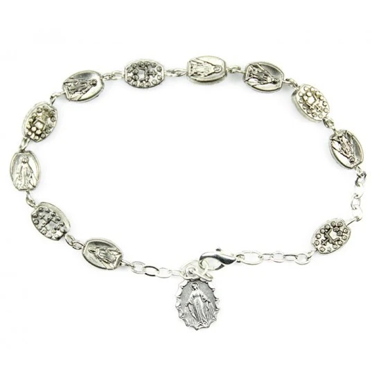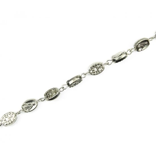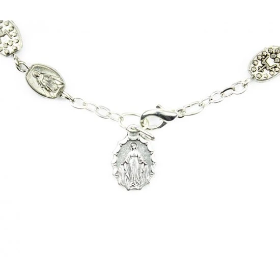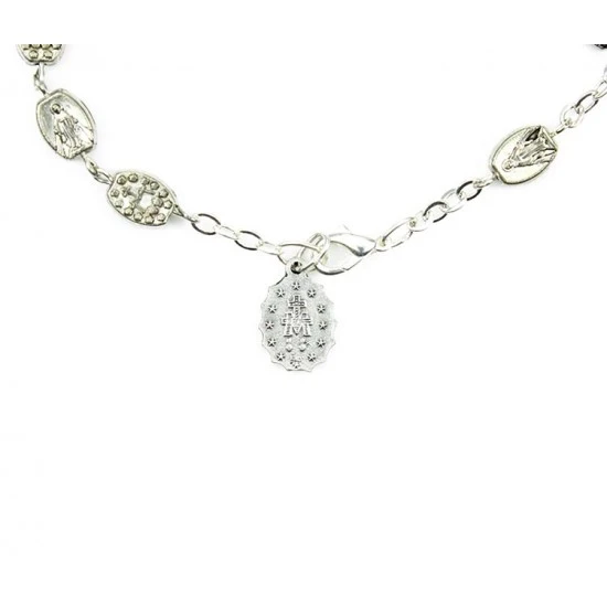 Bracciale con grani in metallo a forma di medaglia Miracolosa con retro stemma, legatura e pendente in metallo argentato. Il bracciale è munito di moschettone per essere indossato.