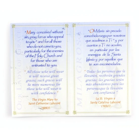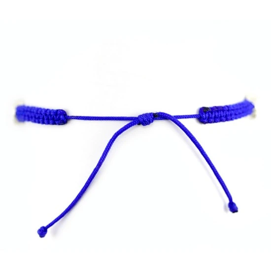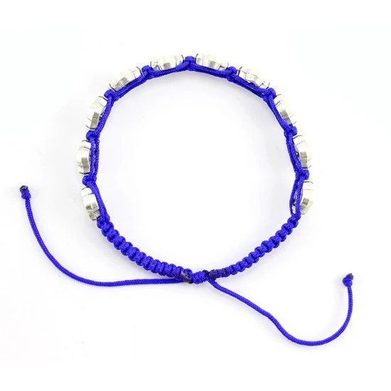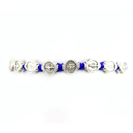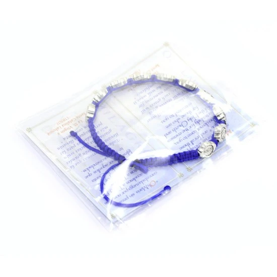 Rosario a bracciale realizzato con Medaglie della Madonna Miracolosa in fusione argentate intrecciate con spago di colore blu. Il bracciale è munito di un sistema di regolazione molto pratico per essere regolato al momento in cui viene indossato al polso. Fornito completo di bustina e cartoncino illustrativo.