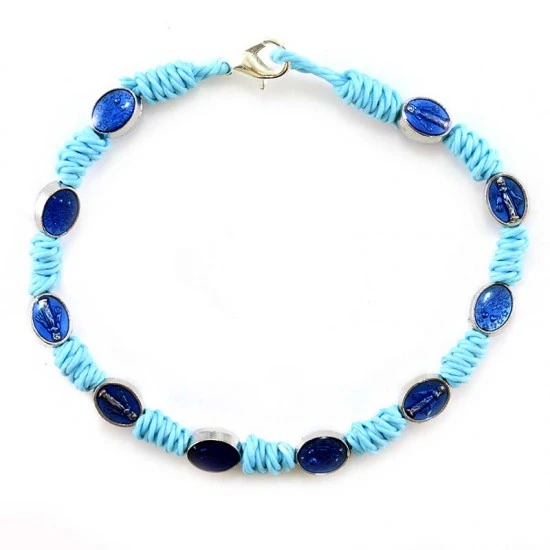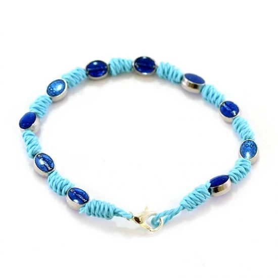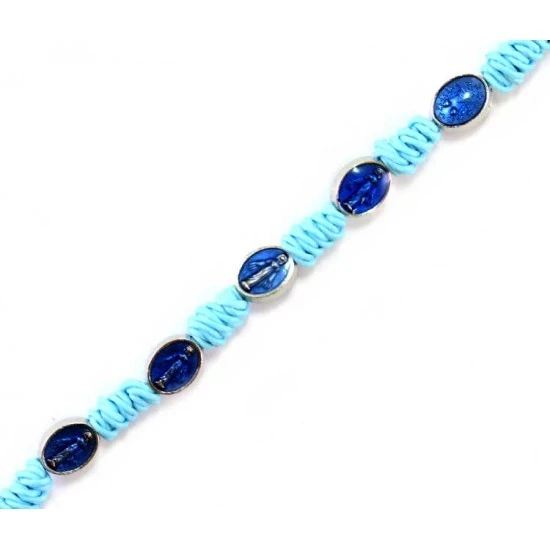 Rosario a bracciale realizzato con 10 Medaglie in metallo con smalto blu raffiguranti la Madonna Miracolosa legate con cordoncino di colore celeste. Il bracciale è munito di chiusura con gancio in metallo argentato.
