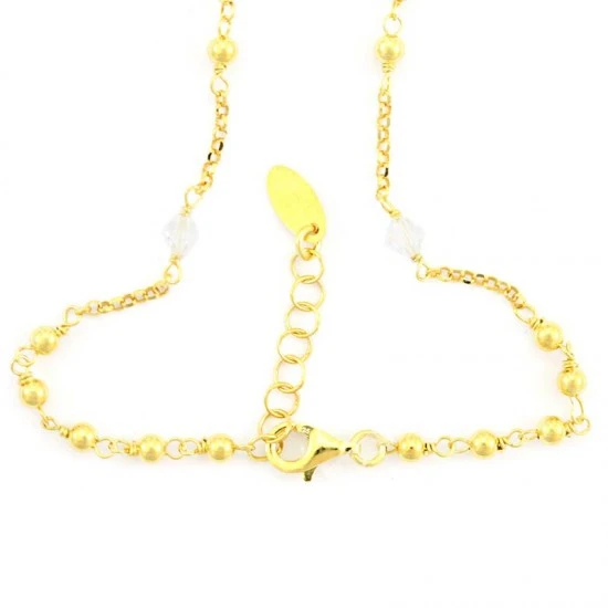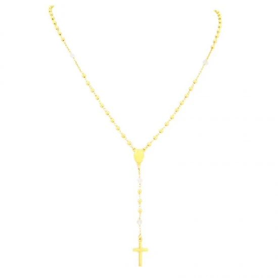 Rosario collana realizzato in argento 925 dorato con 6 grani di swarovski trasparenti, impreziosito dalla crociera raffigurante la Medaglia Madonna Miracolosa e crocetta pendente. Il rosario è munito di gancio apribile utile per essere indossato comodamente e fornito in sacchetto di velluto viola. Made in Italy