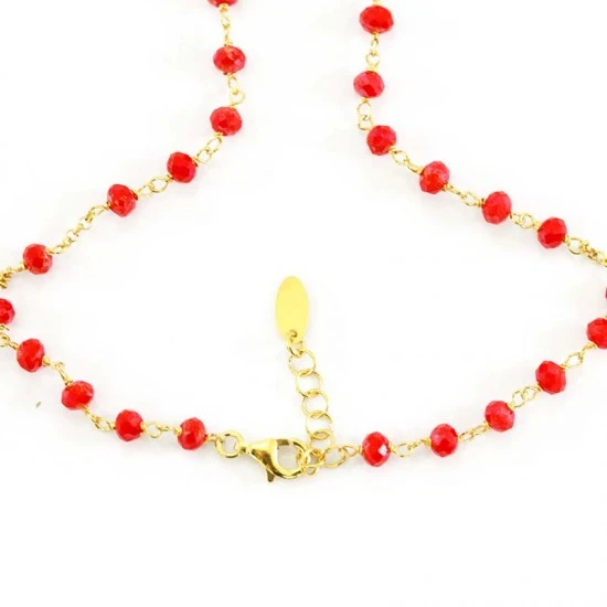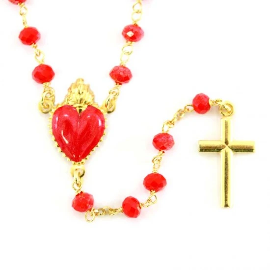 Rosario collana realizzato in argento 925 dorato con grani di vetro sfaccettato rosso, impreziosito dalla crociera raffigurante un cuore smaltato rosso e crocetta pendente. Il rosario è munito di gancio apribile utile per essere indossato comodamente e fornito in elegante scatola di cartone colore blu. Made in Italy