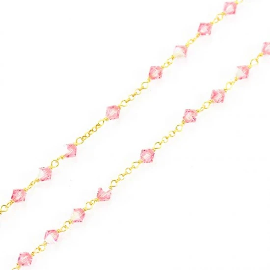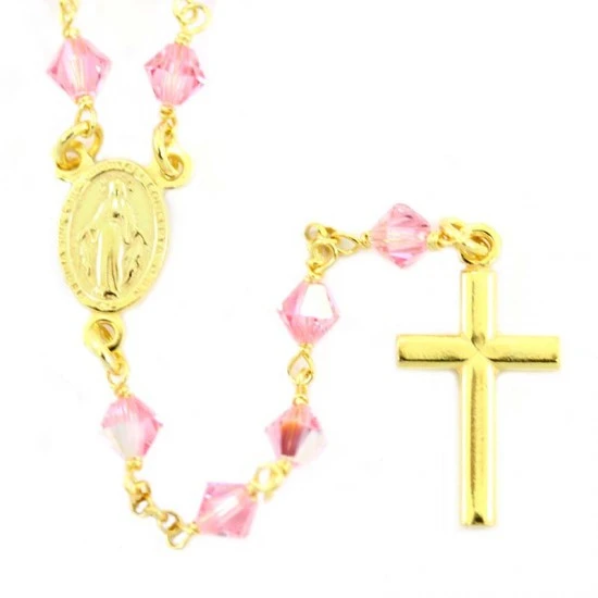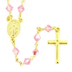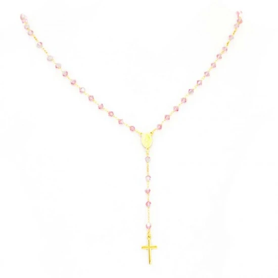 Rosario collana realizzato in argento 925 dorato con grani di swarovski rosa, impreziosito dalla crociera raffigurante la Medaglia Madonna Miracolosa e crocetta pendente. Il rosario è munito di gancio apribile utile per essere indossato comodamente e fornito in sacchetto di velluto viola. Made in Italy