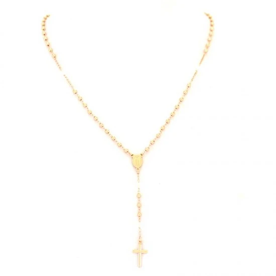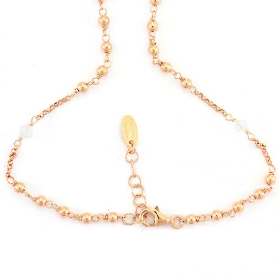 Rosario collana realizzato in argento 925 ramato con 6 grani di swarovski trasparenti, impreziosito dalla crociera raffigurante la Medaglia Madonna Miracolosa e crocetta pendente. Il rosario è munito di gancio apribile utile per essere indossato comodamente e fornito in sacchetto di velluto viola. Made in Italy