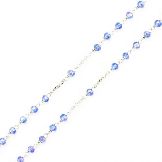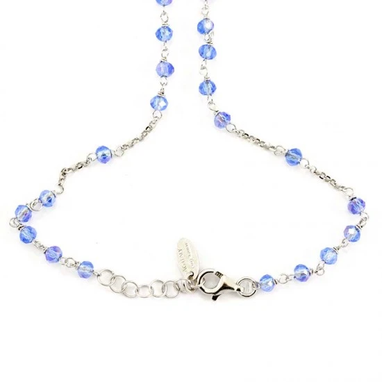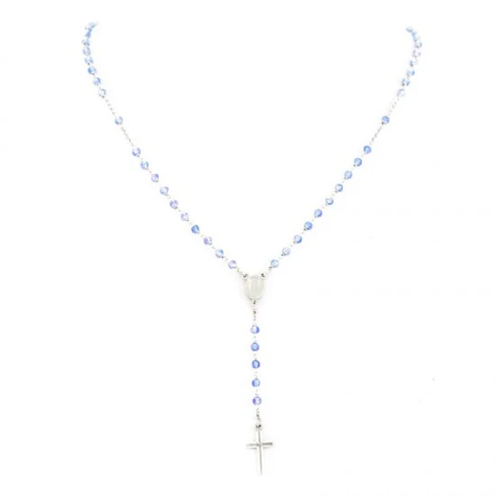 Rosario collana realizzato in argento 925 rodiato con grani di semi cristallo celeste, impreziosito dalla crociera raffigurante la Medaglia Madonna Miracolosa e crocetta pendente. Il rosario è munito di gancio apribile utile per essere indossato comodamente e fornito in sacchetto di velluto viola. Made in Italy