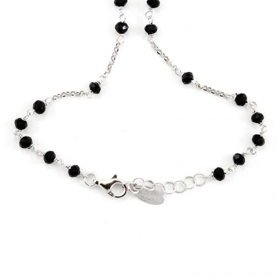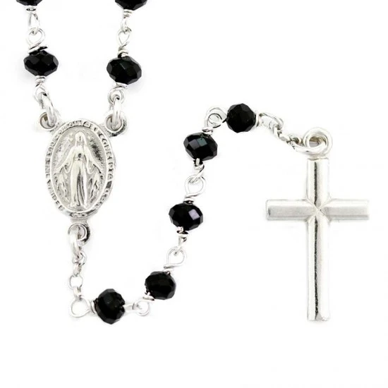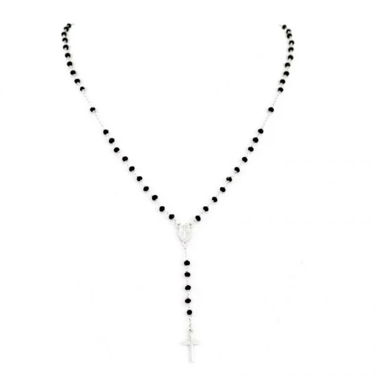Rosario collana realizzato in argento 925 rodiato con grani di semi cristallo neri, impreziosito dalla crociera raffigurante la Medaglia Madonna Miracolosa e crocetta pendente. Il rosario è munito di gancio apribile utile per essere indossato comodamente e fornito in sacchetto di velluto viola. Made in Italy