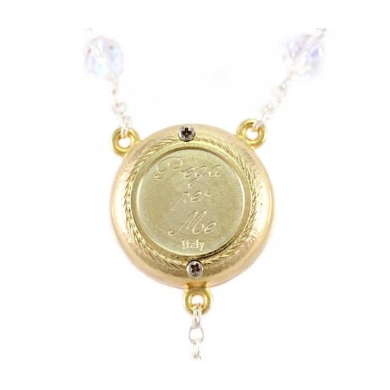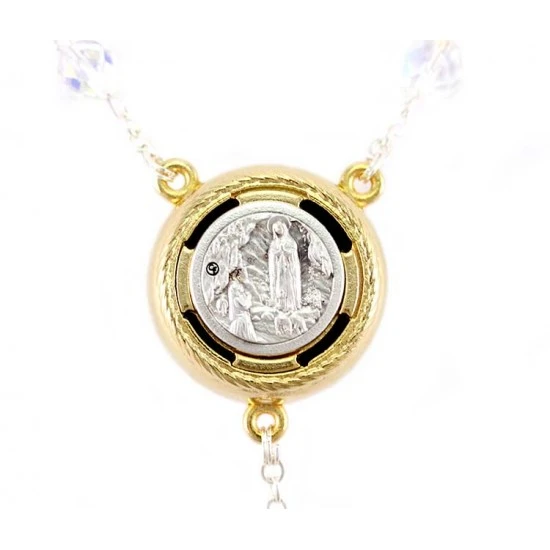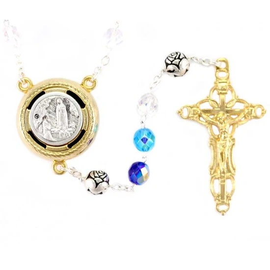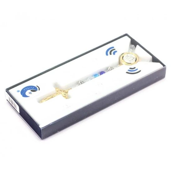 Rosario Ave Maria elettronico realizzato con grani in vetro di colore diverso per ogni decina, legati con catenina in metallo argentato. Il Crocifisso pendente è realizzato in metallo dorato. La crociera raffigura la Madonna di Lourdes con scritta “Prega per me” sul retro. Per ascoltare la preghiera Ave Maria bisogna fare una lieve pressione al centro della crociera. Il prodotto funziona con pila (inclusa) ed è fornito completo di elegante astuccio.