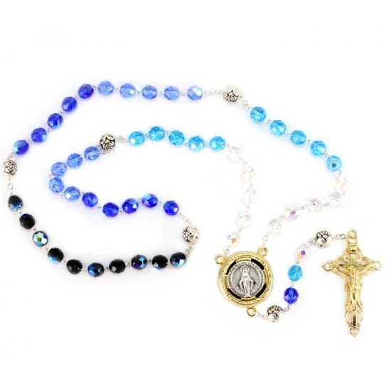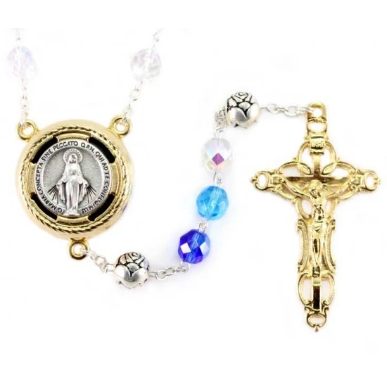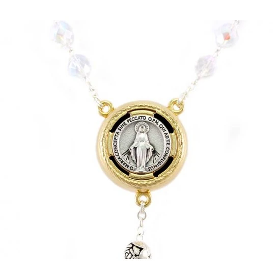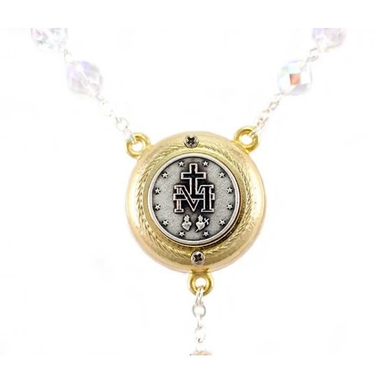 Rosario Ave Maria elettronico realizzato con grani in vetro di colore diverso per ogni decina, legati con catenina in metallo argentato. Il Crocifisso pendente è realizzato in metallo dorato. La crociera raffigura la Madonna Miracolosa con stemma sul retro. Per ascoltare la preghiera Ave Maria bisogna fare una lieve pressione al centro della crociera. Il prodotto funziona con pila (inclusa) ed è fornito completo di elegante astuccio.
