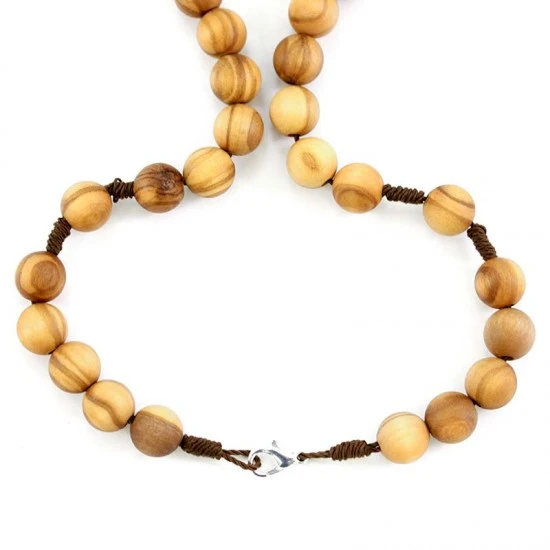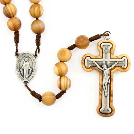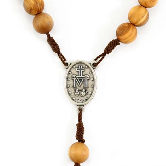 Rosario Ave Maria realizzato con grani tondi in legno di olivo legati con spago marrone, impreziosito dalla crociera della Medaglia Miracolosa e il crocifisso pendente in metallo, il crocifisso è incastrato su croce in legno. Il rosario è munito di gancio a molla per essere indossato comodamente. Made in Italy
