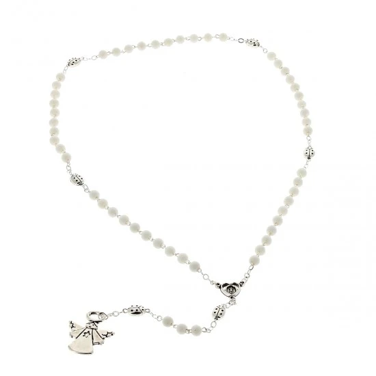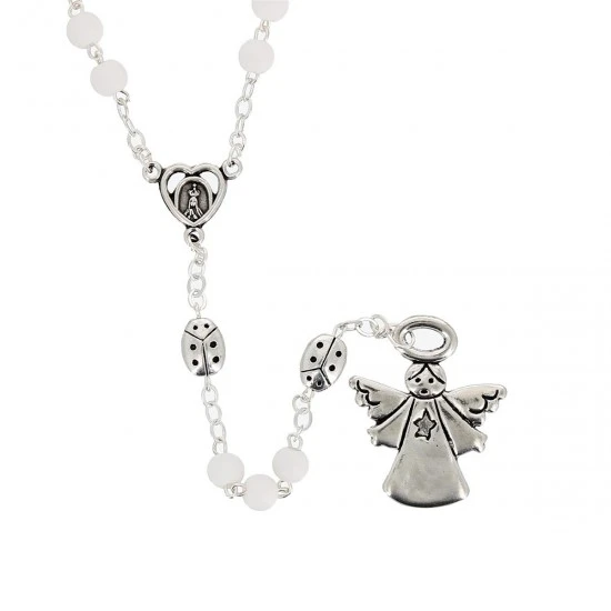 Rosario Madonna di Fatima realizzato con grani tondi in plastica colore bianco e pater sostituiti da coccinelle in metallo argentato. Il rosario è impreziosito dalla crociera raffigurante la Madonna di Fatima e un Angelo pendente in metallo argentato, fornito in bustina di plastica trasparente.