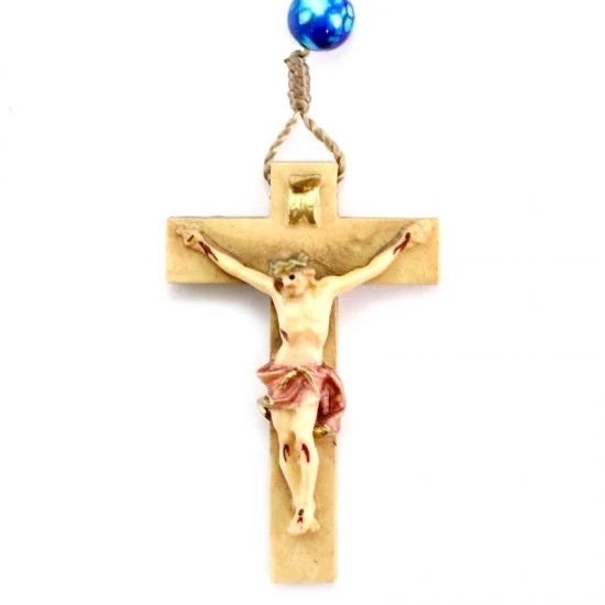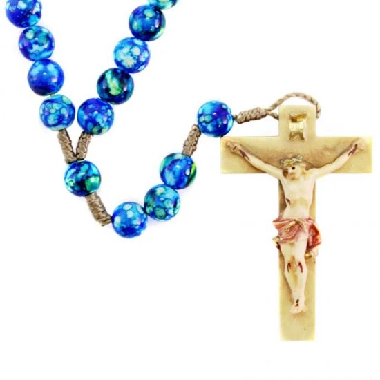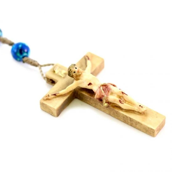 Splendido Rosario realizzato con grani tondi blu imitazioni di pietre dure legati con spago colorato. Il Crocifisso pendente è realizzato interamente in legno colorato, prodotto eseguito con lavorazione artigianale di ottima fattura e ben rifinito nei particolari, fornito in elegante sacchetto nero vellutato con laccetto di chiusura. Made in Italy