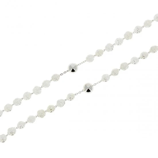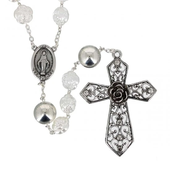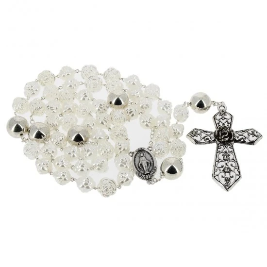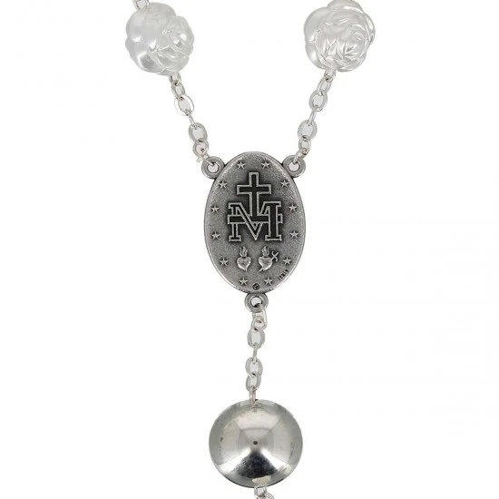 Rosario Capoletto realizzato con grani in plastica bianca a forma di rosa e pater con grani in metallo argentato, legati con catenina in metallo. La crociera raffigurante la Medaglia Miracolosa e la Croce pendente con strass trasparenti sono in metallo argentato. Fornita in bustina di plastica trasparente.