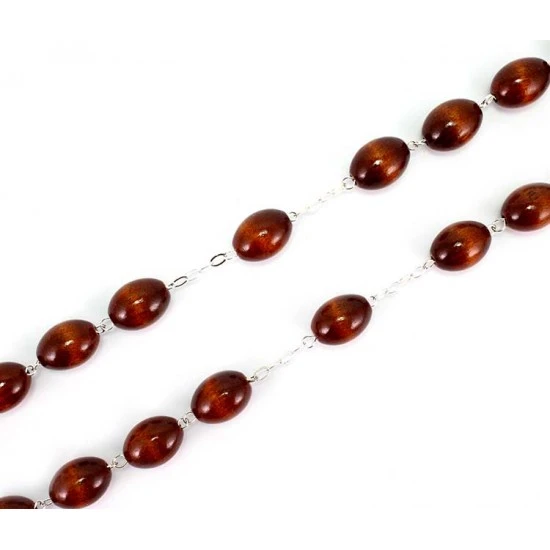 Rosario Capoletto realizzato con grani ovali lisci in legno chiaro e legati con catena in metallo argentato. Il Crocifisso è in legno con corpo in metallo argentato. Made in Italy