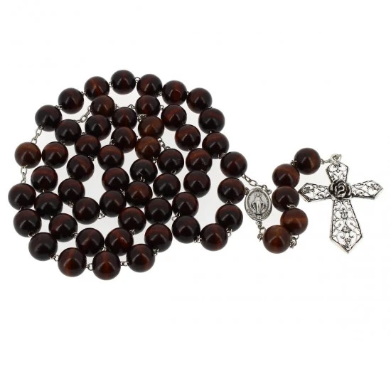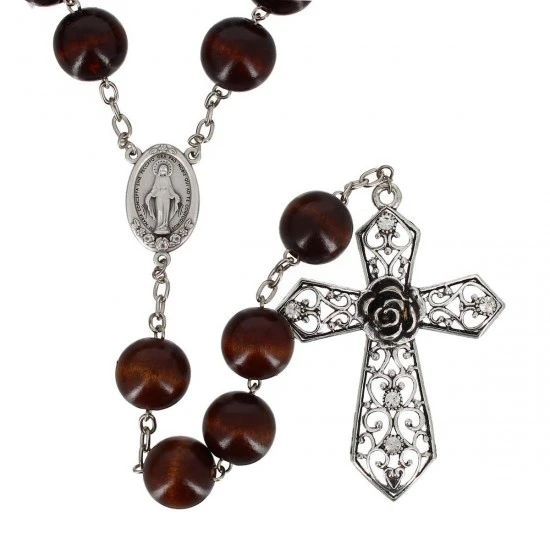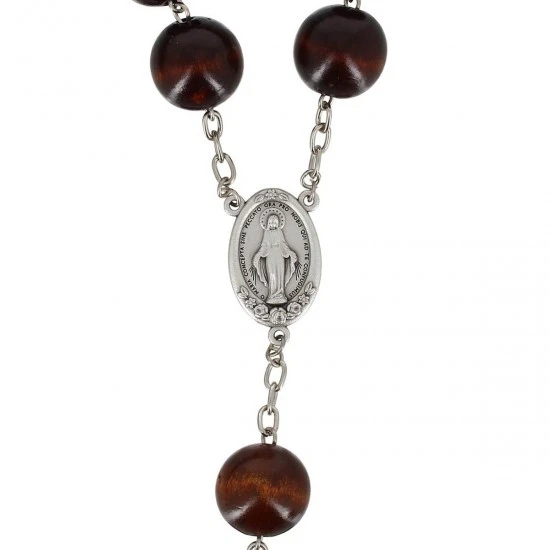 Rosario Capoletto realizzato con grani tondi in legno legati con catenina in metallo argentato e impreziosito dalla crociera raffigurante la Medaglia Miracolosa e dalla Croce pendente con strass trasparenti. Fornito in bustina di plastica trasparente.