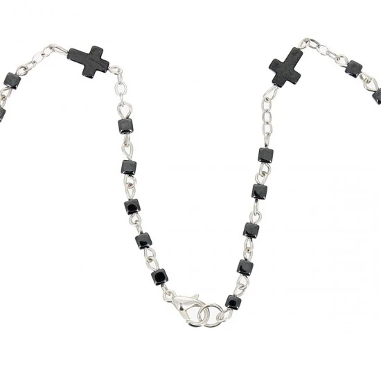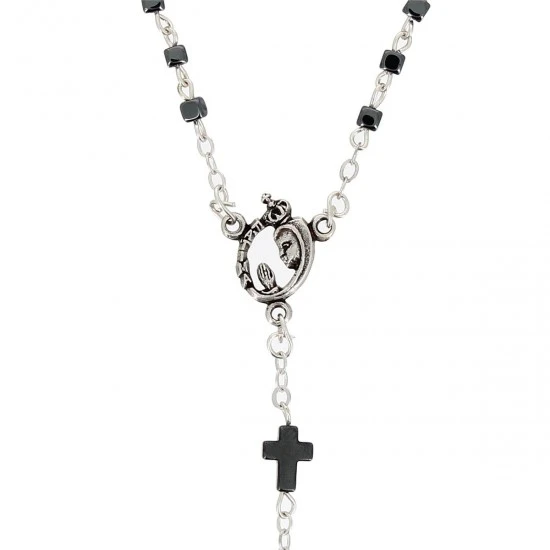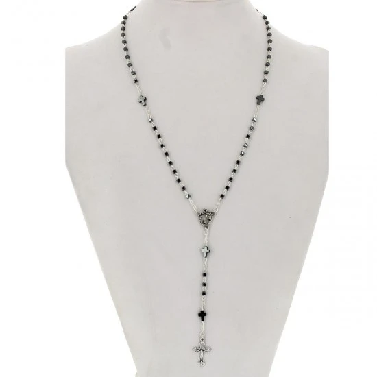 Rosario collana realizzato con grani a forma di cubi ematite e pater sostituiti da piccole croci legati con catenina in metallo. La crociera e la croce pendente sono in metallo argentato. Il rosario è munito di gancio a molla per essere indossato comodamente ed è fornito in bustina di plastica trasparente.