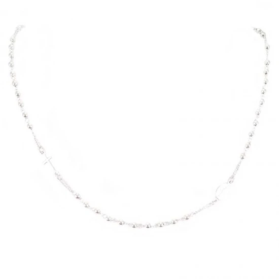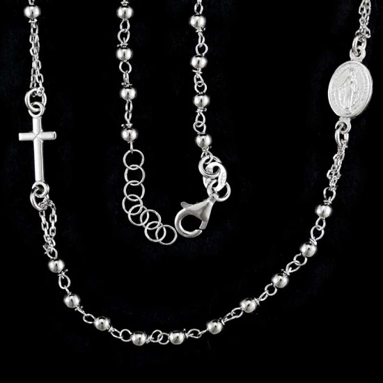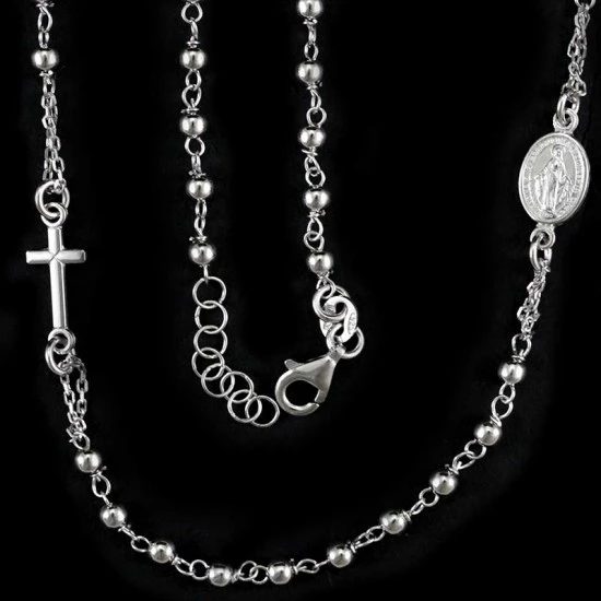 Stupendo Rosario collana girocollo, realizzato interamente in argento 925°° rodiato, con grani tondi e lisci, crocifisso orizzontale e Medaglia Miracolosa. Il Rosario è munito di gancio a molla per essere indossato comodamente e fornito completo di elegante astuccio in cartoncino di colore blu. Made in Italy