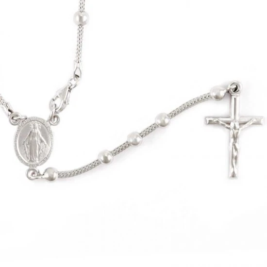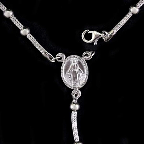 Stupendo Rosario collana realizzato interamente in argento 925°° rodiato, con grani tondi e lisci, crociera raffigurante la Medaglia Miracolosa. Il Rosario è munito di gancio a molla per essere indossato comodamente e fornito completo di elegante astuccio in cartoncino di colore blu. Made in Italy