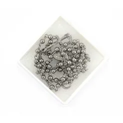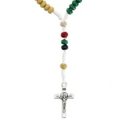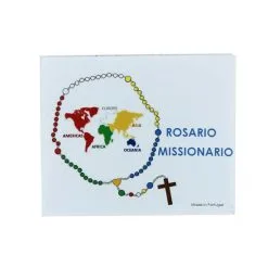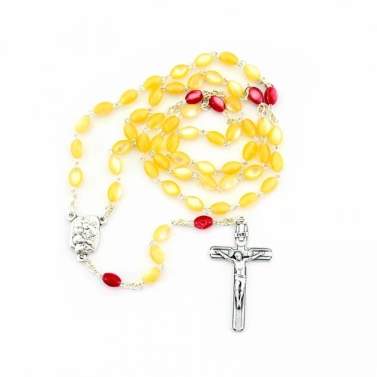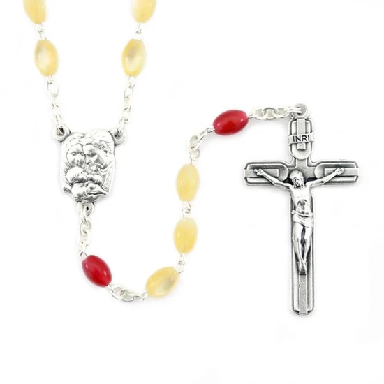 Rosario con borsellino realizzato con grani ovali imitazione madreperla legati con catenina in metallo argentato. Il Crocifisso pendente e la crociera raffigurante la Sacra Famiglia sono in metallo argentato. Il rosario è corredato di borsellino in stoffa con stampa su entrambi i lati e chiusura con cerniera. Made in Italy