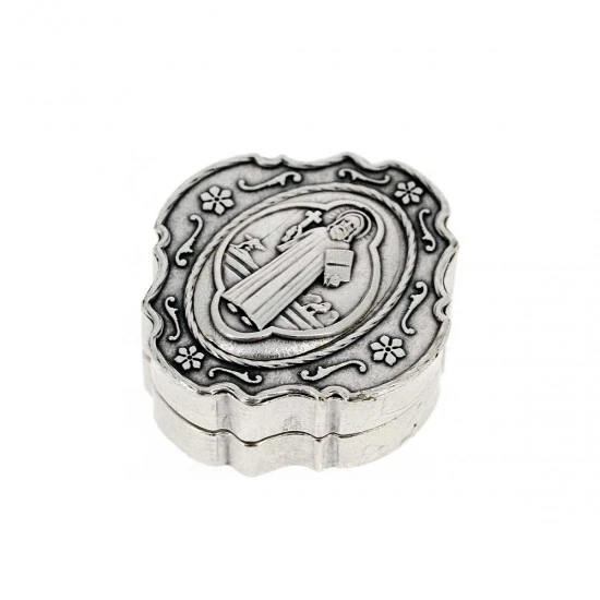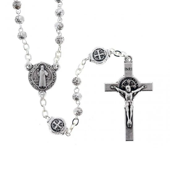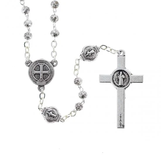 Rosario e Custodia San Benedetto. Rosario in metallo realizzato con grani a forma di rosa impreziosito dal Crocifisso pendente di San Benedetto. La crociera e i pater sono sostituiti da medaglie del Santo, fornito completo di astuccio in metallo con l’effigie di San Benedetto a rilievo.