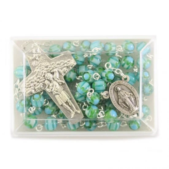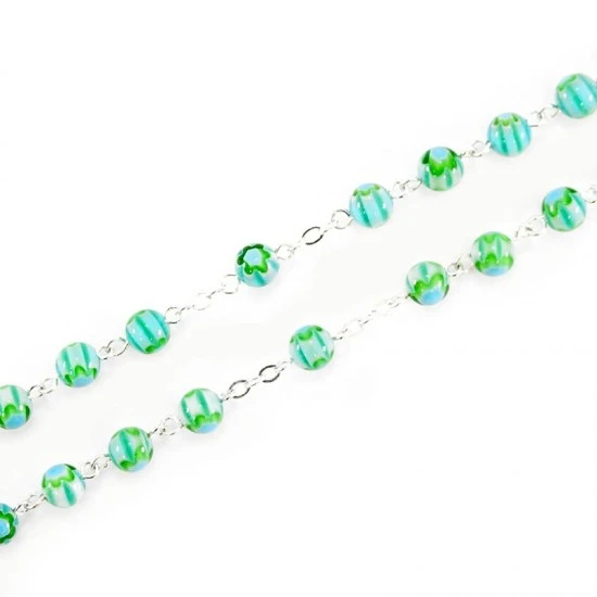 Rosario in vetro realizzato con grani tondi in vetro murrina variegato. La legatura, il crocifisso e la crociera sono in metallo argentato.