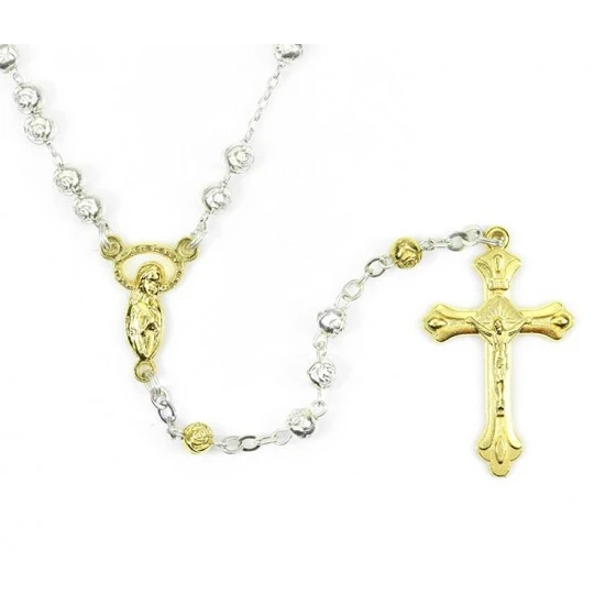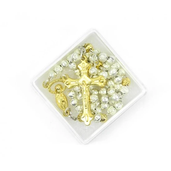 Rosario con grani tondi scorrevoli a forma di rosa in metallo argentato. Il crocifisso, la crociera e i pater sono in metallo dorato.