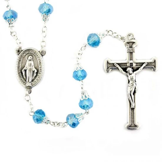 Rosario realizzato con grani in vetro sfaccettato color acqua avvolti da una coppiglia di metallo traforato e legati con catena in metallo argentato. Crocifisso pendente in metallo di ottima fattura e crociera raffigurante la medaglia Madonna Miracolosa. Fornito in elegante astuccio in plastica colorata. Made in Italy