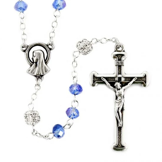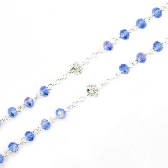 Rosario realizzato con grani tondi in vetro sfaccettato di colore celeste e legati con catena in metallo, la crociera e il Crocifisso pendente sono in metallo argentato. Il rosario è munito di gancio apribile utile per essere indossato comodamente ed è fornito in elegante scatola di cartone. Made in Italy