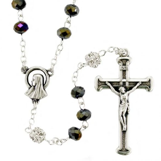 Rosario realizzato con grani tondi in vetro sfaccettato di colore scarabeo e legati con catena in metallo, la crociera e il Crocifisso pendente sono in metallo argentato. Il rosario è munito di gancio apribile utile per essere indossato comodamente ed è fornito in elegante scatola di cartone. Made in Italy
